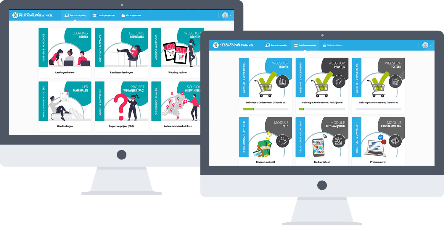 De Schoolwebwinkel werkt vanuit één overzichtelijk platform. Hierin staan – afhankelijk van de gekozen variant – alle theorie, verwerkingsvragen, praktijkopdrachten, CMS-opdrachten en de webshopomgeving (inclusief CMS-handleiding).